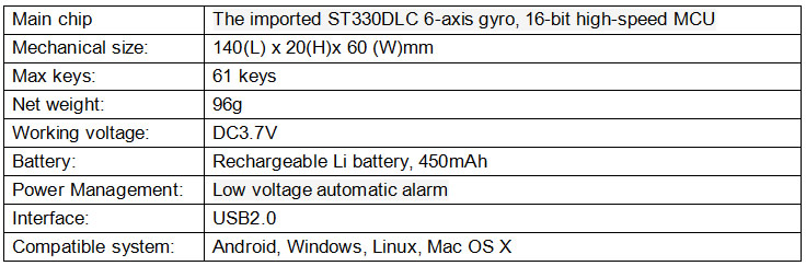 Flymouse II+ is the updated version with more comfortable hand operation with its ergonomic shape. the length of 140mm makes it possible for two thumbs to be able to operate all the keys on the keyboard. The new improved algorithm makes drawing circle or curve on the screen more delicate and smooth. built-in 450mAh rechargeable lithium battery, no need to replace the battery all the time, once fully charged, it can be used for more than 2 months; charging could be fulfilled through the USB port, charge 2 hours can be filled with more than 90% capacity, convenient and quick. somatosensory 2D/3D game pack installed on the embedded host, hold the Flymouse II + and changes of body movements to operate on these video games, to realize human-computer interaction, and homes will be able to enjoy the sport of immersive, and also with friends to participate in a showdown; it contains a number of shortcut keys so that to enable one key to open the Web browser, one key to enter the application; It is the best control equipment in triple play era of smart TV, network player.